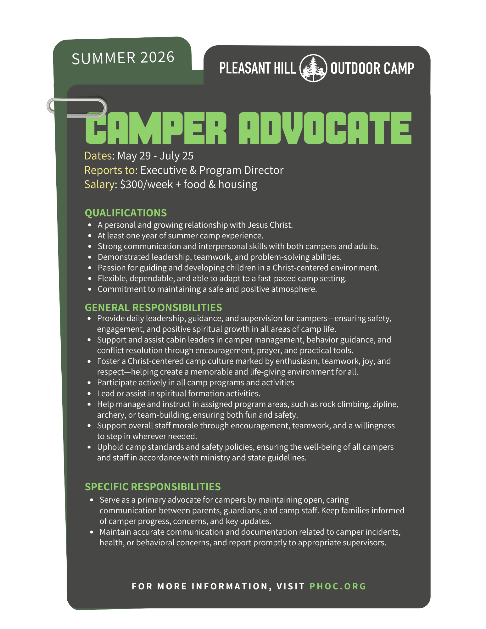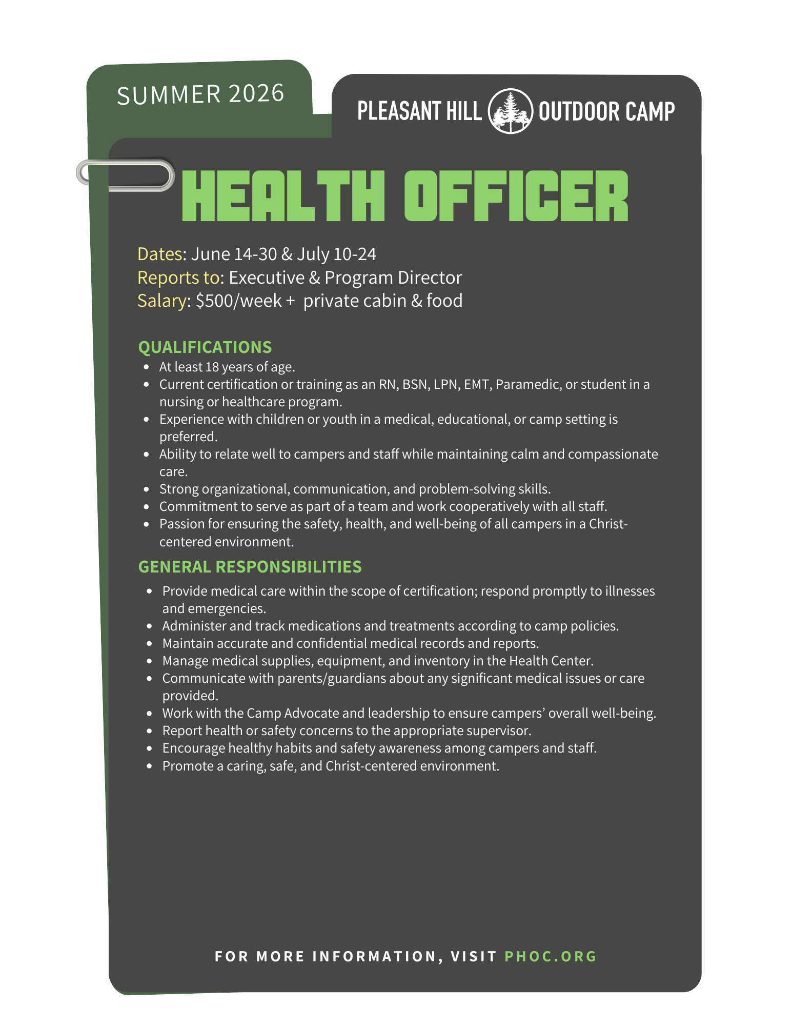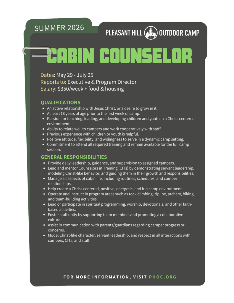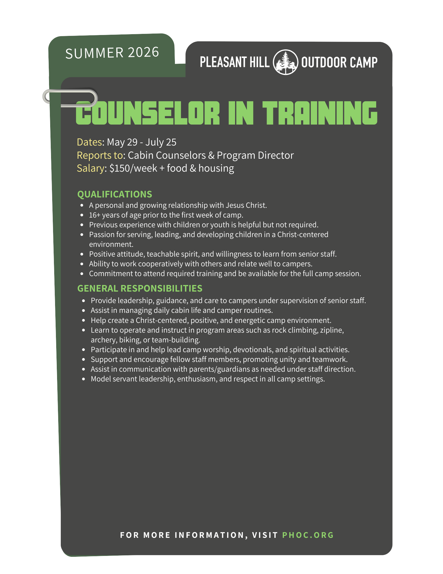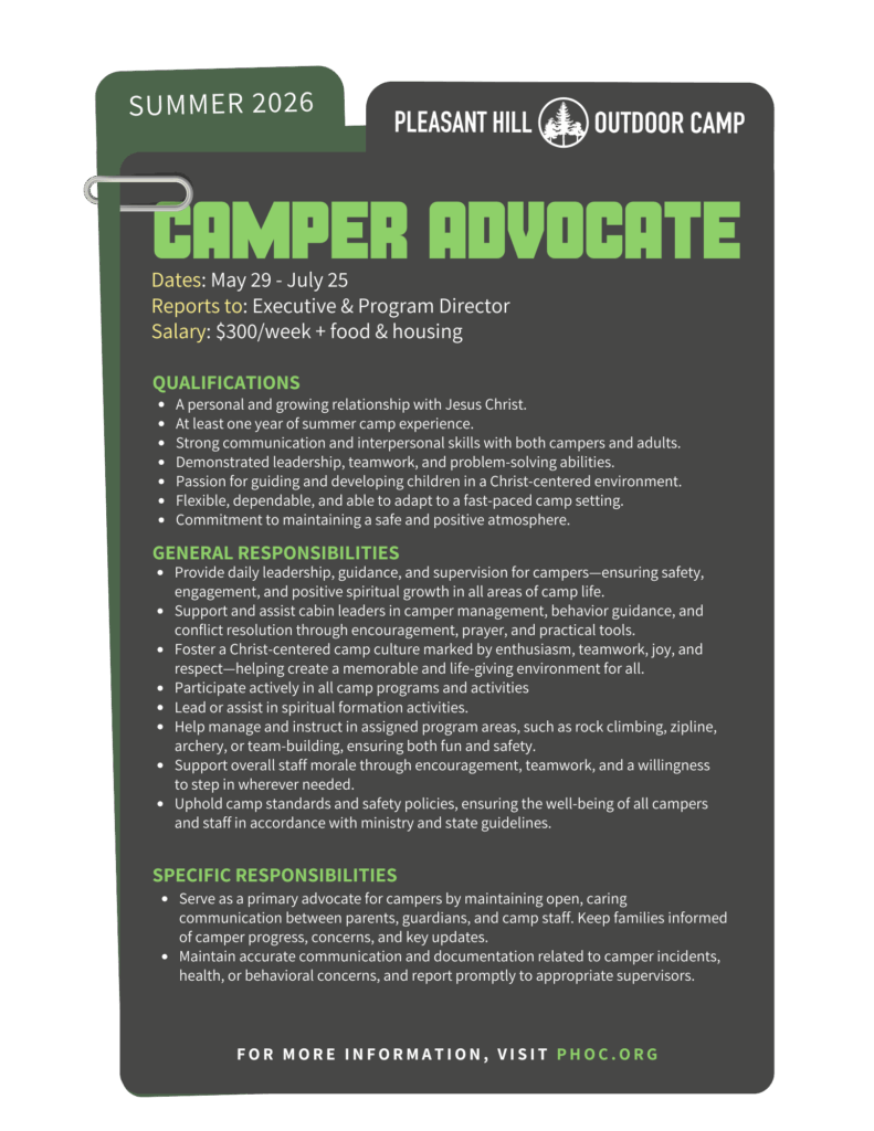 Pleasant Hill believes strongly that supporting each summer staff member is essential. We are genuinely concerned that you have a dynamic, growth-filled experience. So, we provide the following resources for all summer staff: