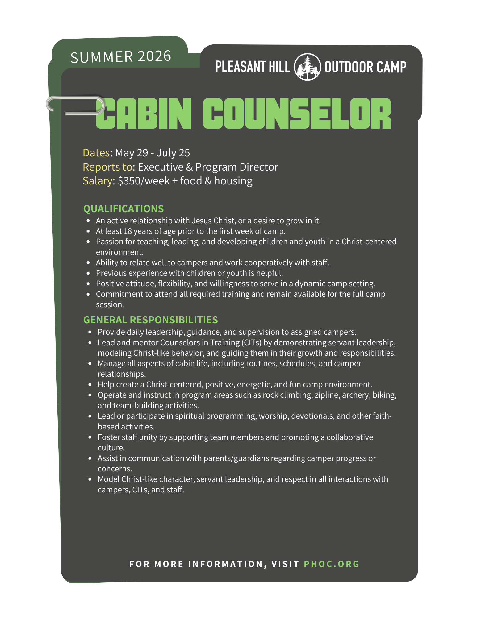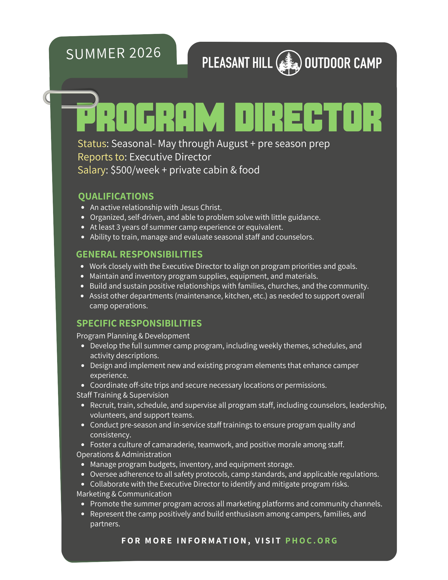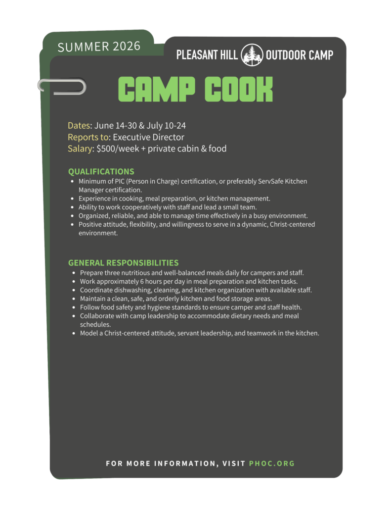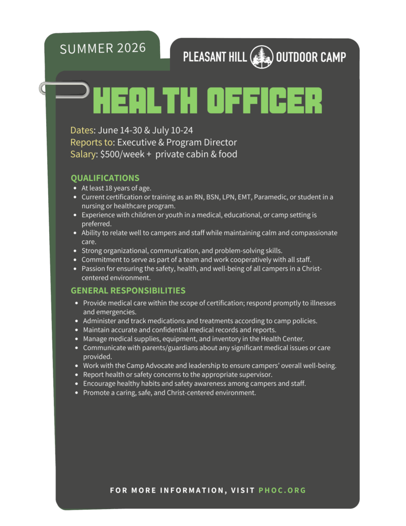 Pleasant Hill believes strongly that supporting each summer staff member is essential. We are genuinely concerned that you have a dynamic, growth-filled experience. So, we provide the following resources for all summer staff: