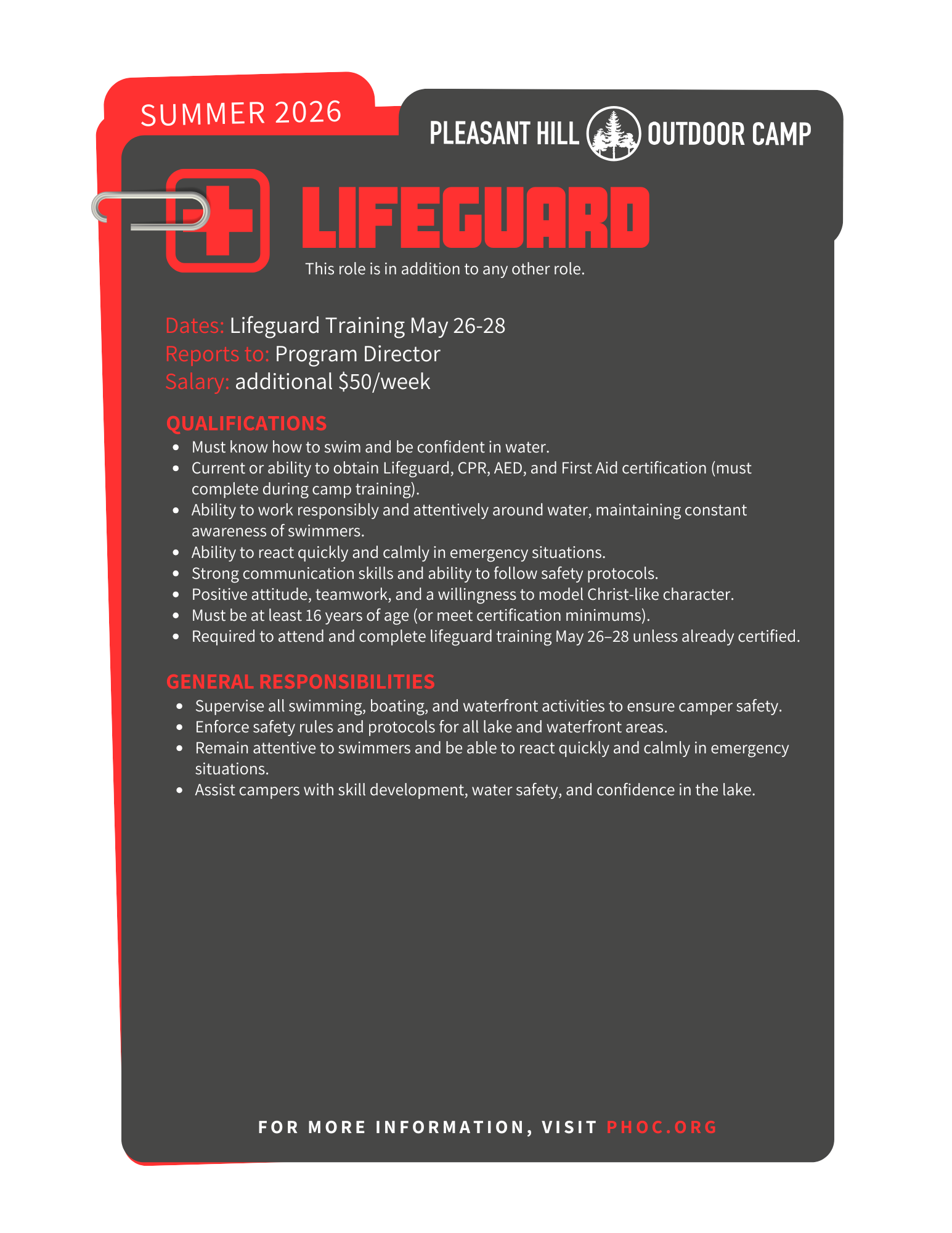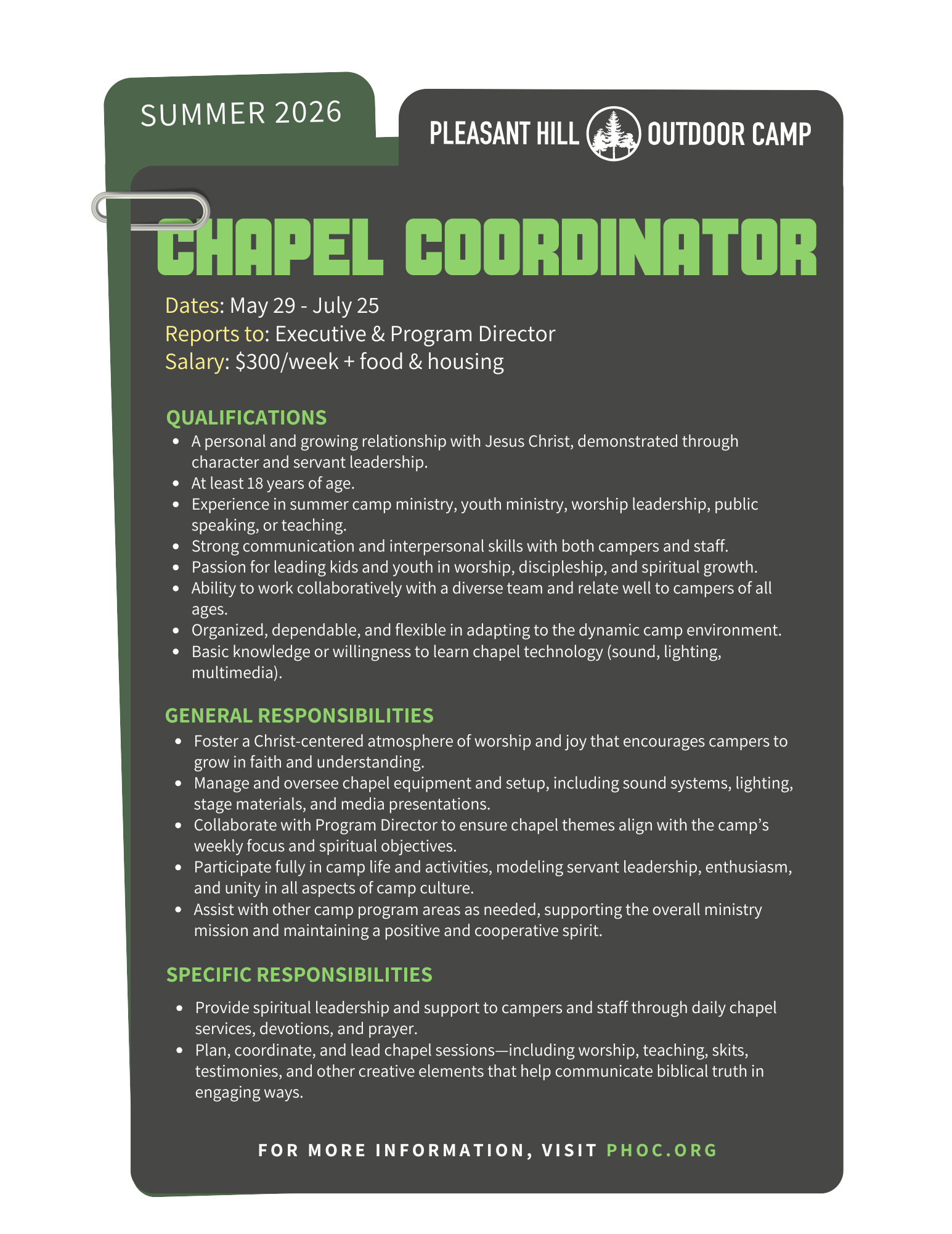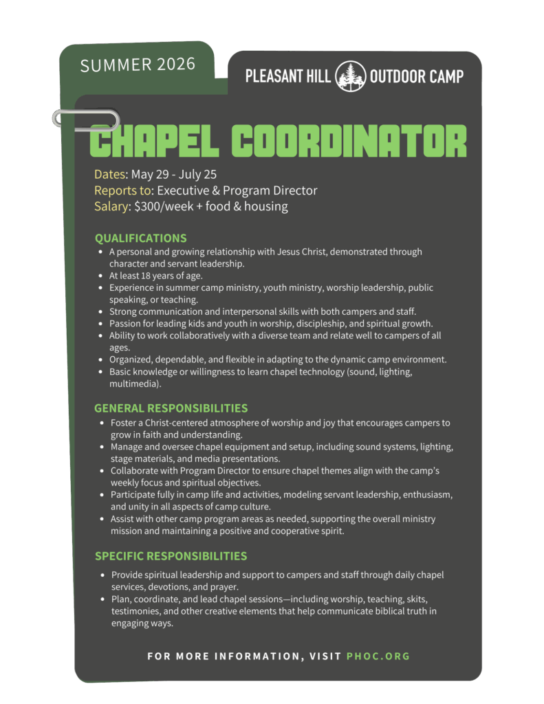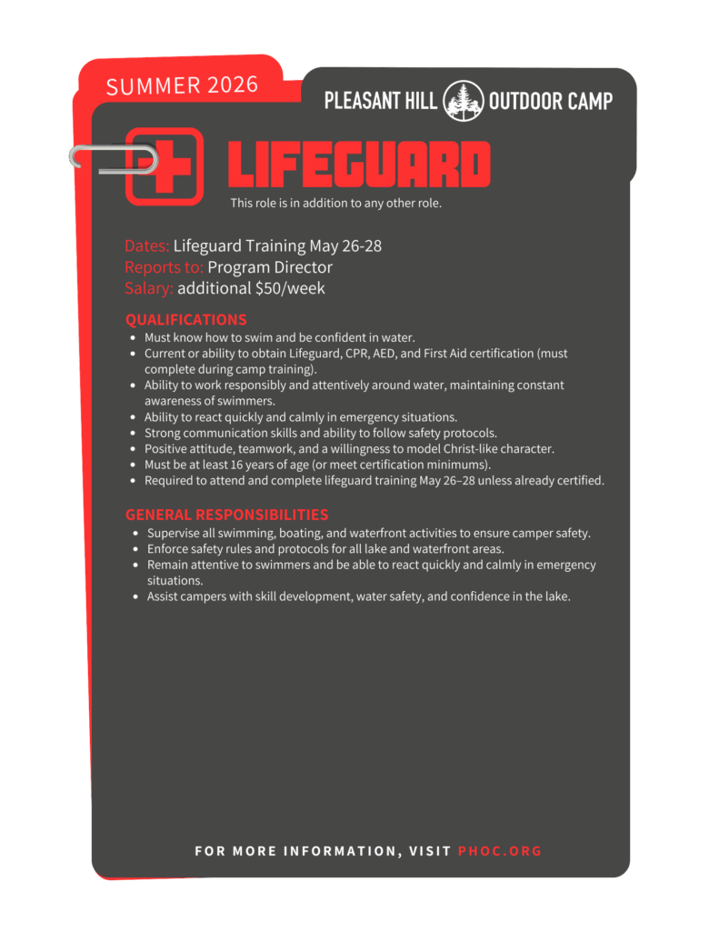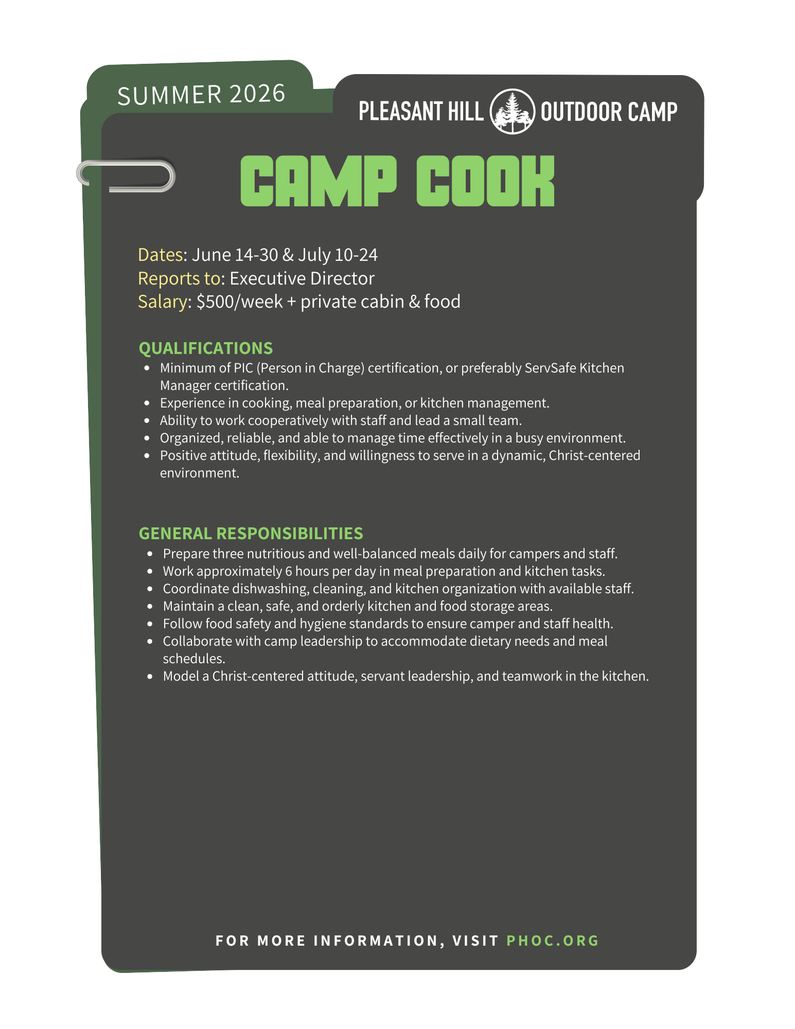 Pleasant Hill believes strongly that supporting each summer staff member is essential. We are genuinely concerned that you have a dynamic, growth-filled experience. So, we provide the following resources for all summer staff: